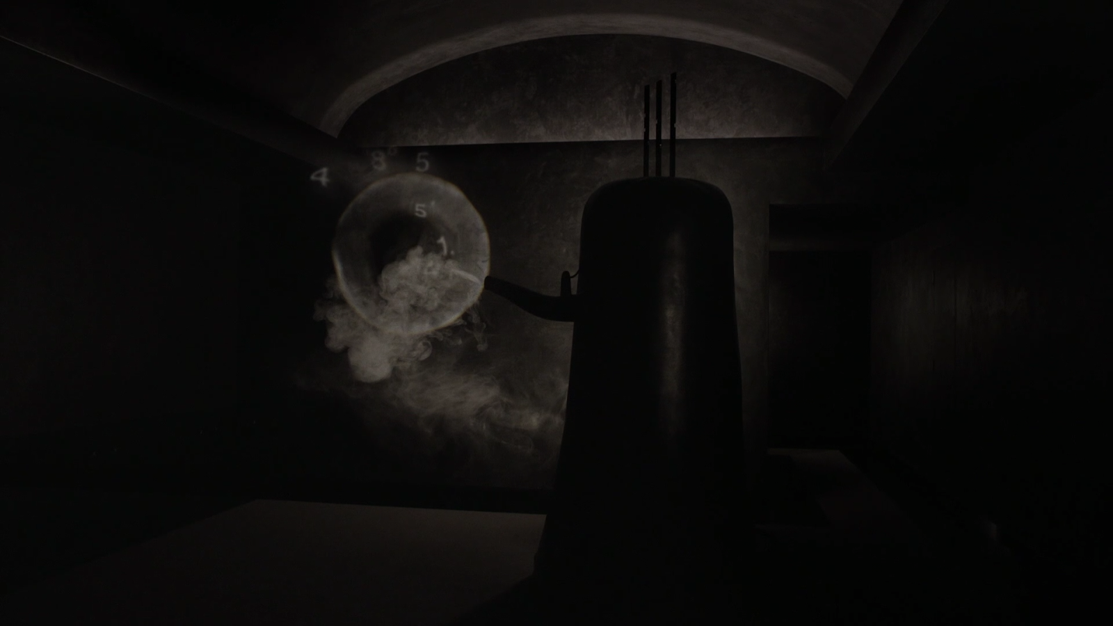 Inside there is a one of the bell shaped objects that we have seen in the Fireman’s place.It is emitting smoke/steam.Looking a lot like a teakettle. There is a rhythmic repeating clanking sound of machinery followed by an ominous hum that is reminiscent of slow breathing,Or what one might imagine in an antiquated pump of Mr Frump's iron lung. A circle of smoke,or sphere ,perhaps, sits at the end of the pipe that is emitting the smoke.Is it pumping it into the circle?Is THAT Jeffries, and the bell is keeping him alive?IS Jeffries inside the device? Is Jeffries THE device?Or just communicating through the device? None of his dialogue indicates that he is actually seeing the Bad Dale despite his first line.